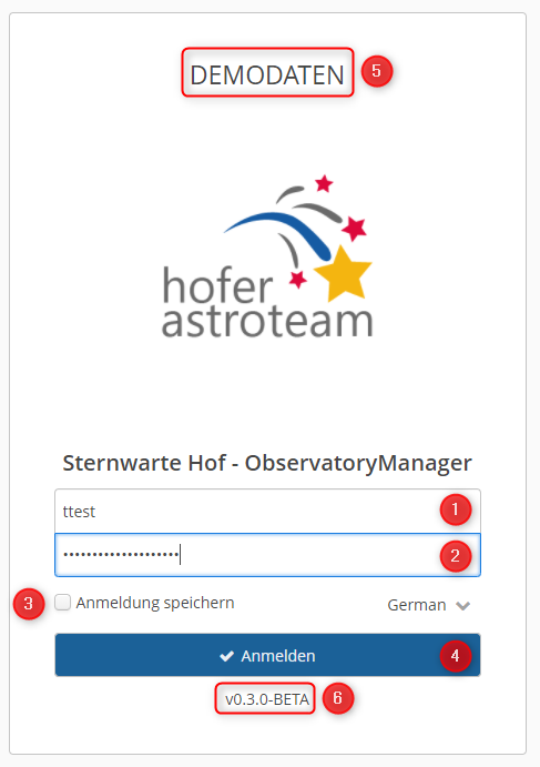 Für Demo- und Schulungszwecke können Systeme mit Demodaten bestückt werden. In diesem Fall zeigt der Login-Screen im oberen Bereich einen entsprechenden Hinweis (5) an.